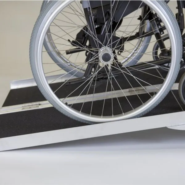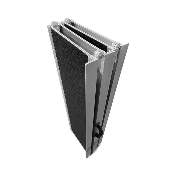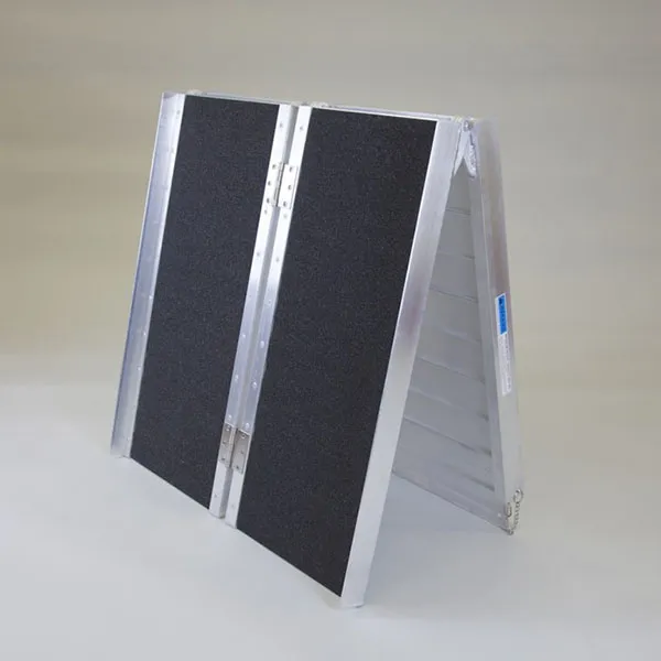 Lekka, składana aluminiowa rampa, zabezpieczona antypoślizgową powierzchnią, łatwa do przenoszenia.
