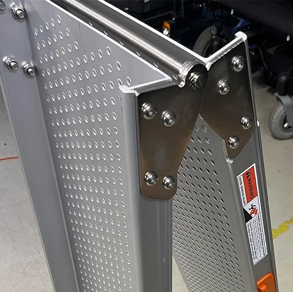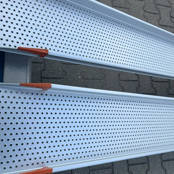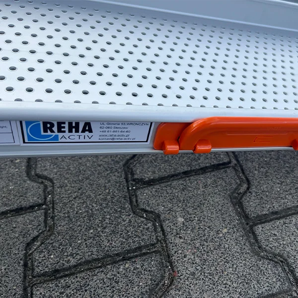 Szyny perforowane REHA-ACTIV o długości 300 cm, zaprojektowane dla niestandardowych wózków i skuterów, które mają szerszy rozstaw kół lub rozmiar jest niestandardowy. Szyny posiadają perforowaną powierzchnię, która zapewnia przyczepność oraz ułatwia oczyszczanie kół z zabrudzeń. Ładowność szyn to aż 350 kg, co czyni je idealnym rozwiązaniem dla osób o większej wadze. Zatrzaski boczne pozwalają na blokadę długości szyn w wybranym miejscu. Boki szyn zostały dodatkowo wyprofilowane, aby ułatwić wjazd mniejszych wózków.